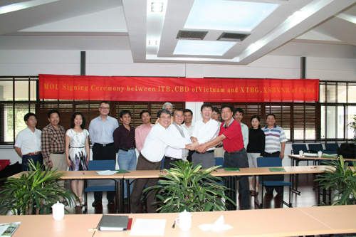 越南代表团在版纳植物园访问期间,中越双方召开了座谈会。参加座谈会的人员有越南外宾,版纳植物园主任陈进研究员,副主任曹敏研究员以及有关科技人员等;西双版纳州国家级自然保护区管理局局长杨松海、副局长刘林云,保护区管理局科研所所长陈明勇和生态所所长沈庆仲等也参加了座谈会。在座谈会上,陈进研究员对越南外宾的来访表示热烈的欢迎,并向越南外宾详细介绍了版纳植物园的科学研究、物种保存、园林建设、研究生培养、国际合作等方面的情况。刘林云向外宾介绍了西双版纳州国家级自然保护区的总体情况。随后,中越双方就今后的合作交流等所关心的问题进行了认真的讨论,并签署了科技合作备忘录。